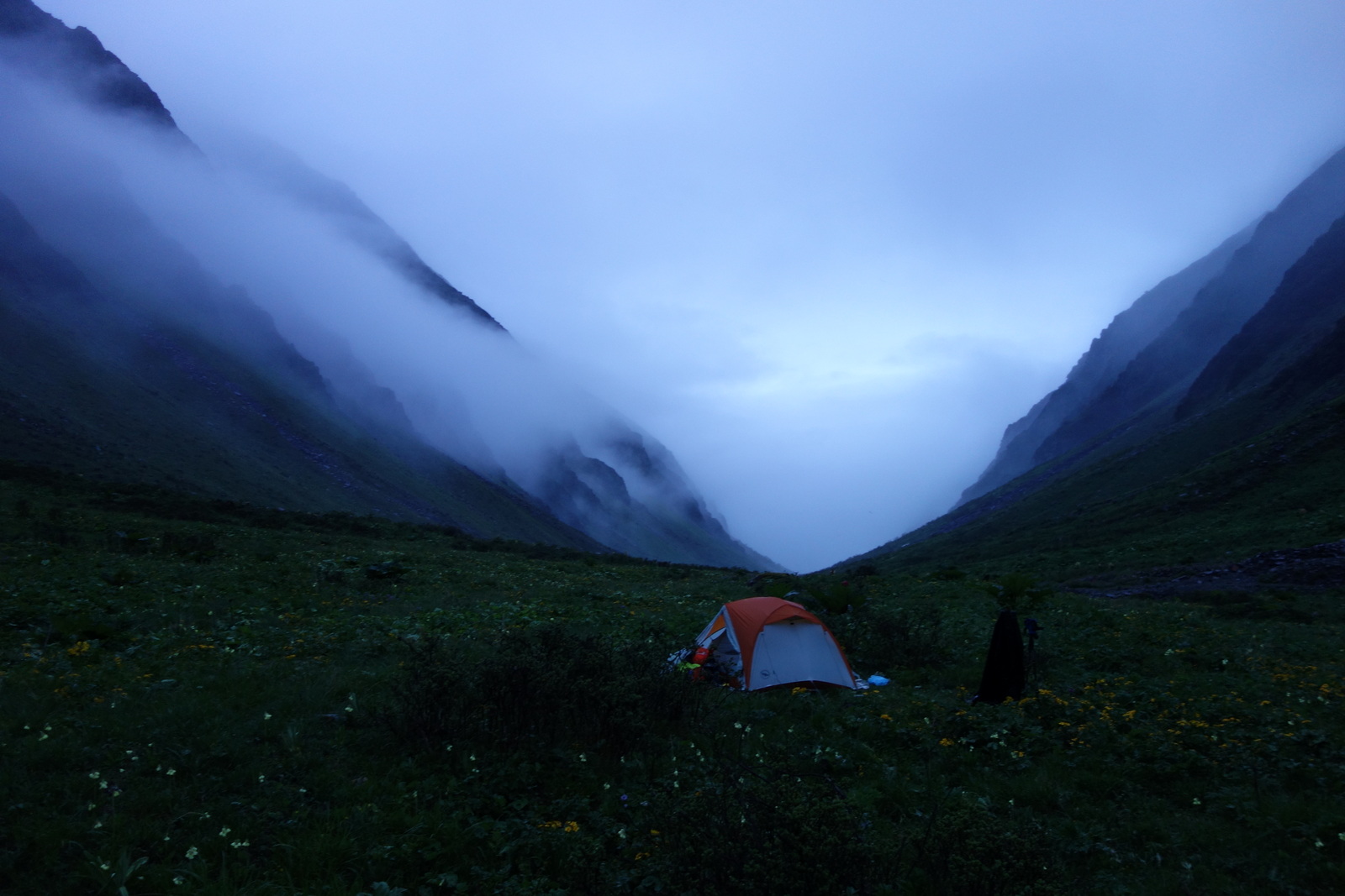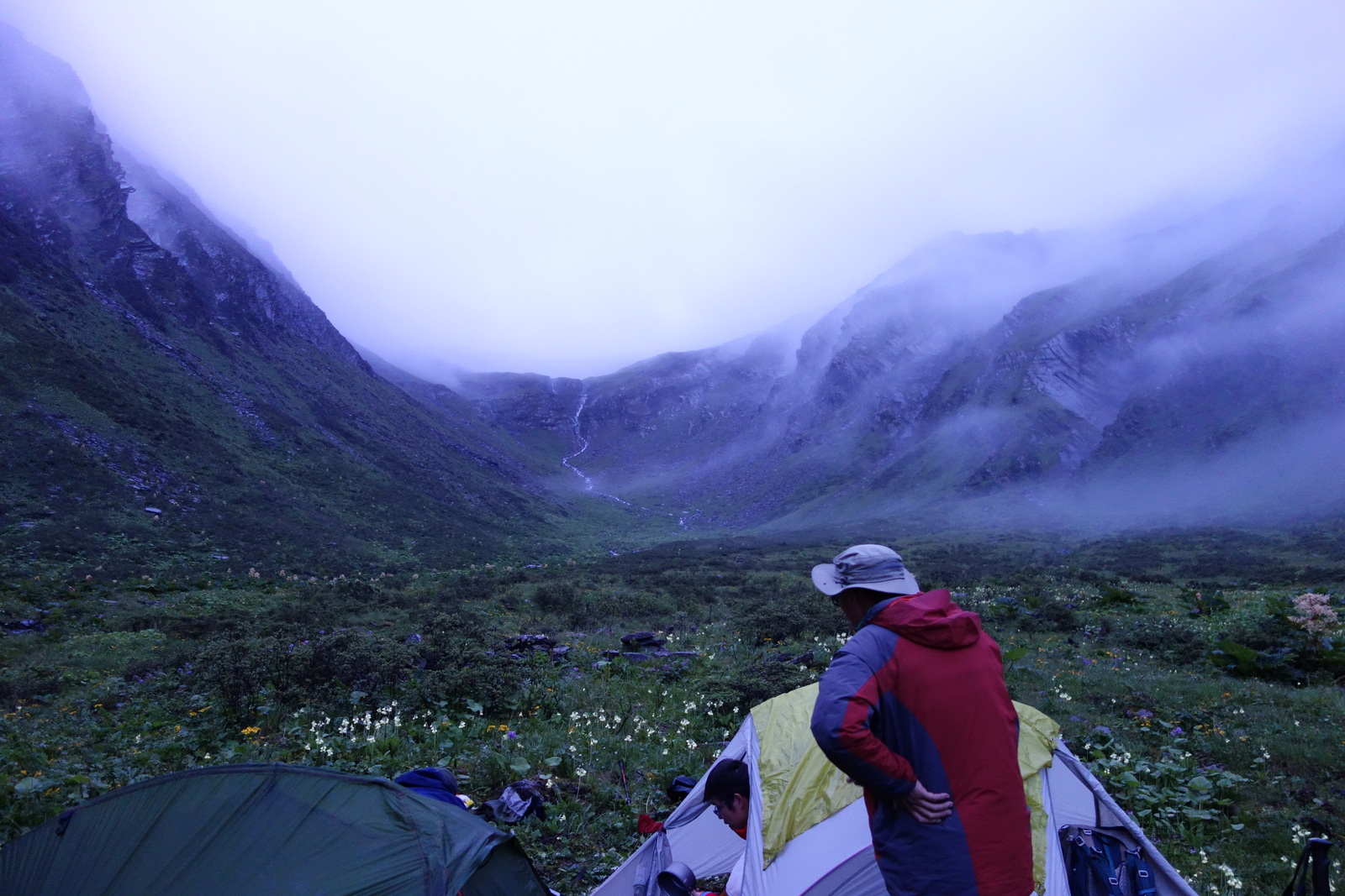 16点整,抵达3400米的牛棚营地,营地植被茂盛,可扎营的面积看起来较小,但平整度看起来不错,水源就在旁边。牛棚的门是开的,除我和骨头呆在外头,其他人都冲进牛棚,为检查蚂蟥,听到里面在:脱的脱,拿的拿盐。骨头递来一根烟,问我要不要抽,我说暂不用。其实,我最想喝水,于是将保温瓶里余下的水,喝光了。余下放在侧包塑料瓶一点水。