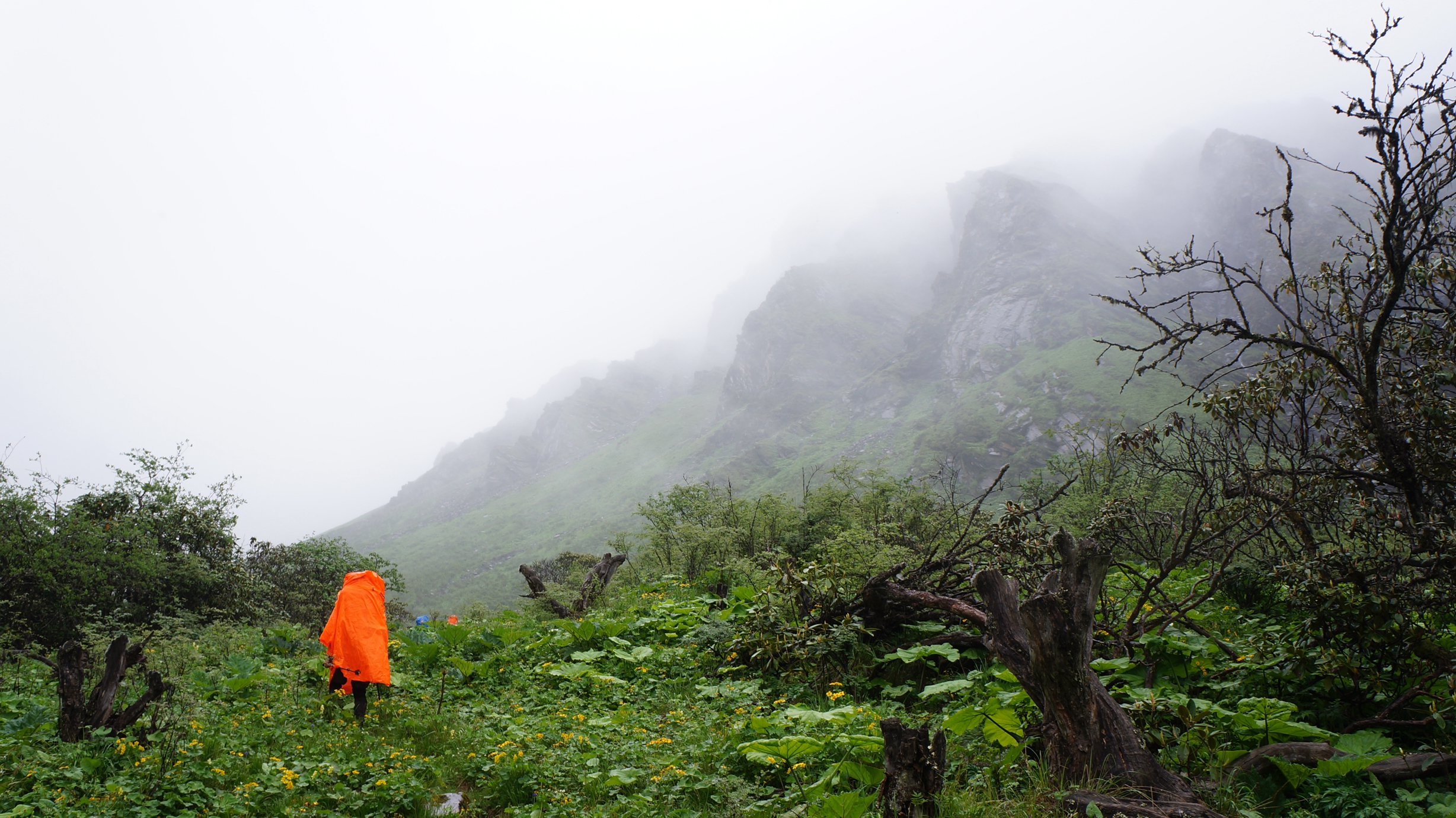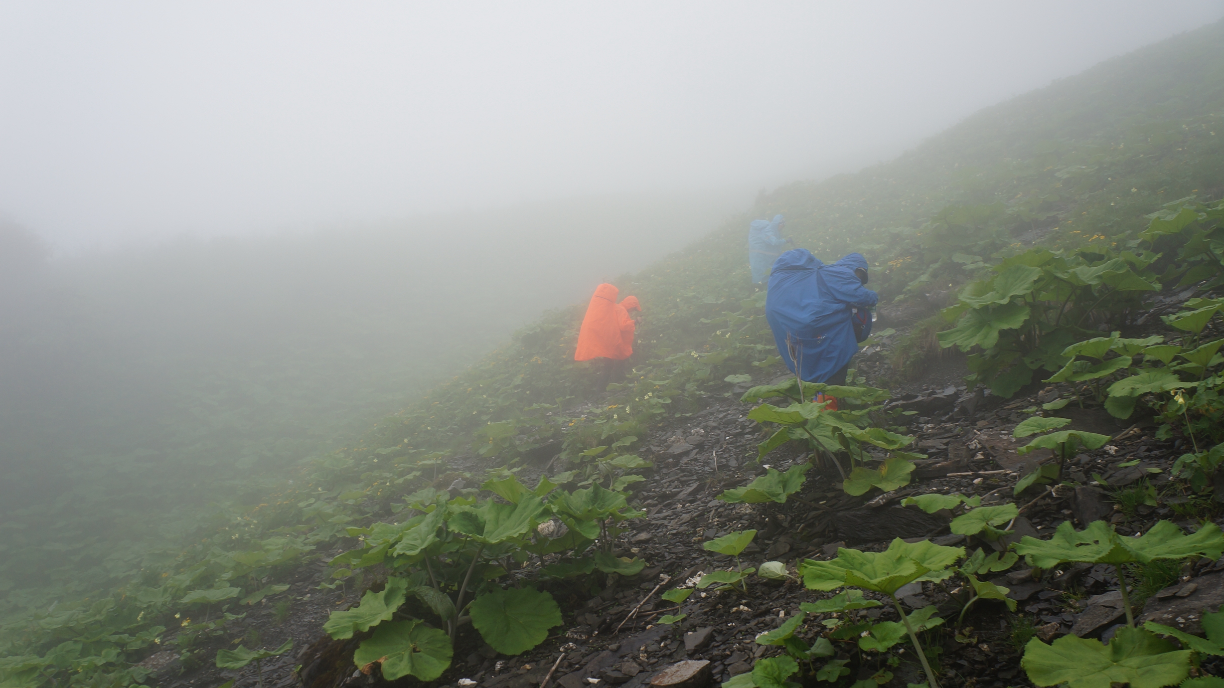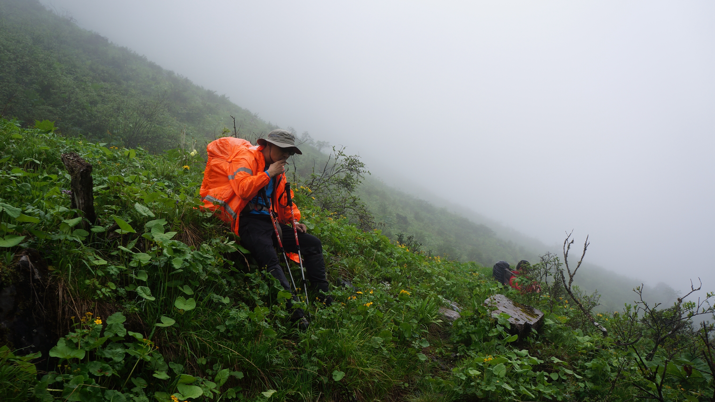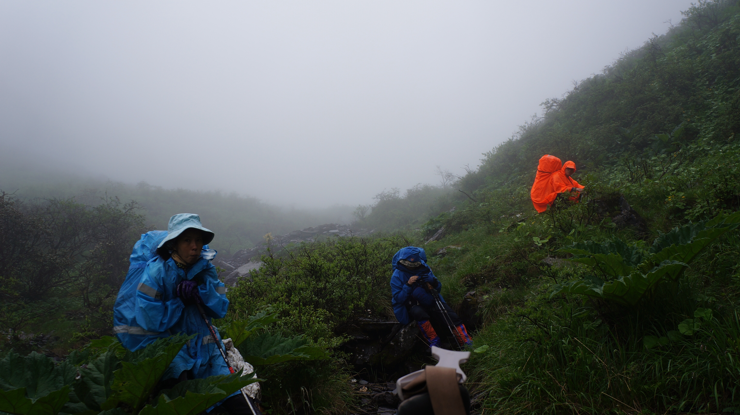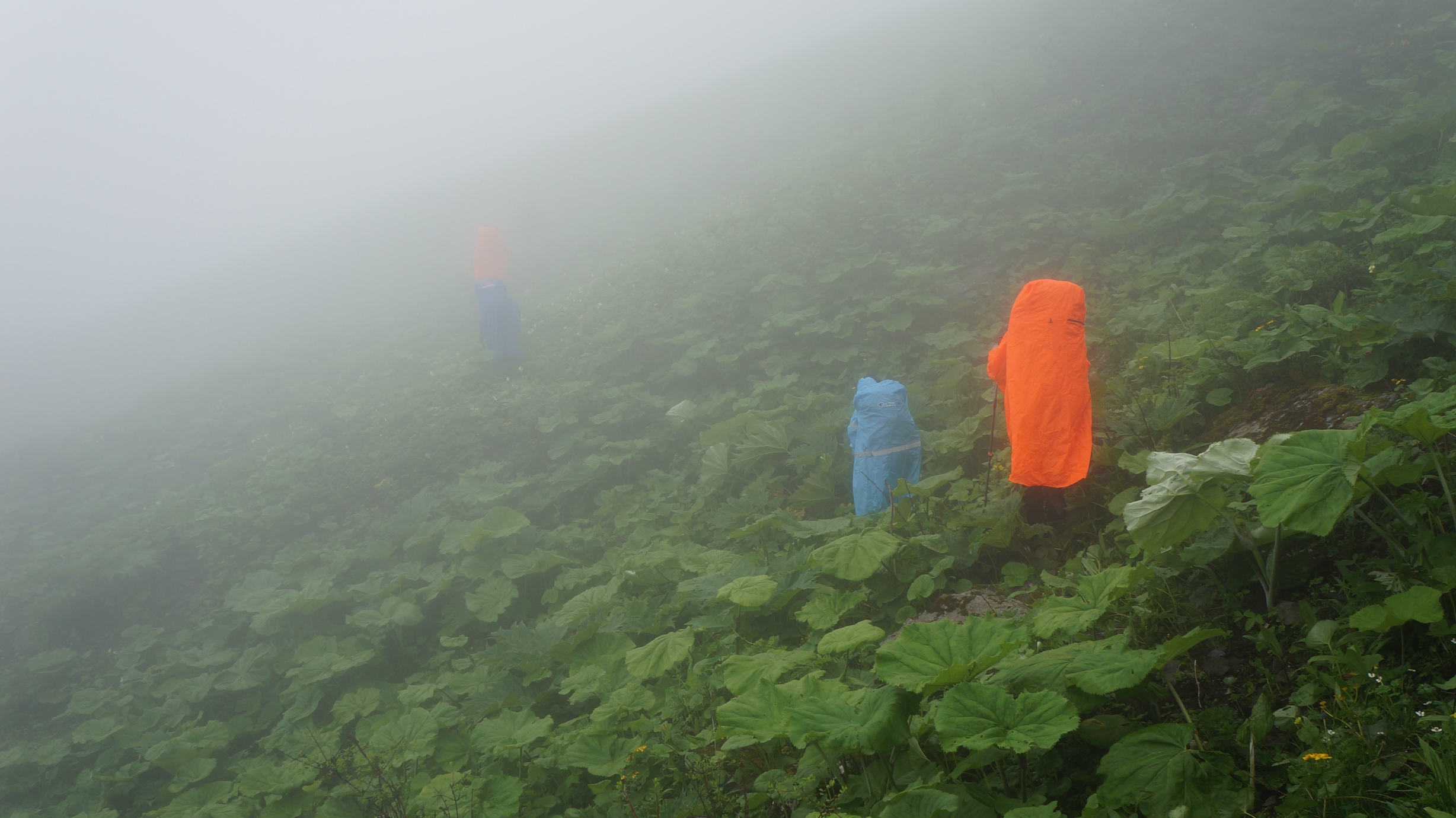 休息半小时后,12:10 分再次起包往前。20多分钟后,雾很大,同时大叶植物也多起来,有时有半人高。老麻说暂停,让大家全部穿雨衣,以方便通过。