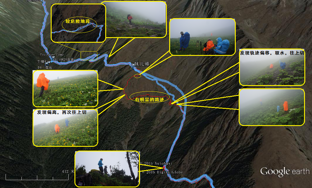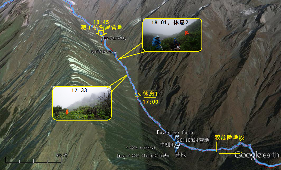 见上面的Google鸟瞰图,有标识出“较危险地段”的地方,是继过石遭垭口之后,我标的第二个危险地段,是一个很陡只容单脚过,而还需手攀才能过的地方,你可别踩滑了,掉下去就是悬崖,绝对是非死既伤!当时记得15:00整,老麻和我先过,然后虎伢要过时,在大声呼叫老麻回头去帮忙。而出来后听队云队开玩笑说,连蛤蟆在这都快吓哭了(是不是真的啊)……所以,请尽量避免在这段走夜路。
