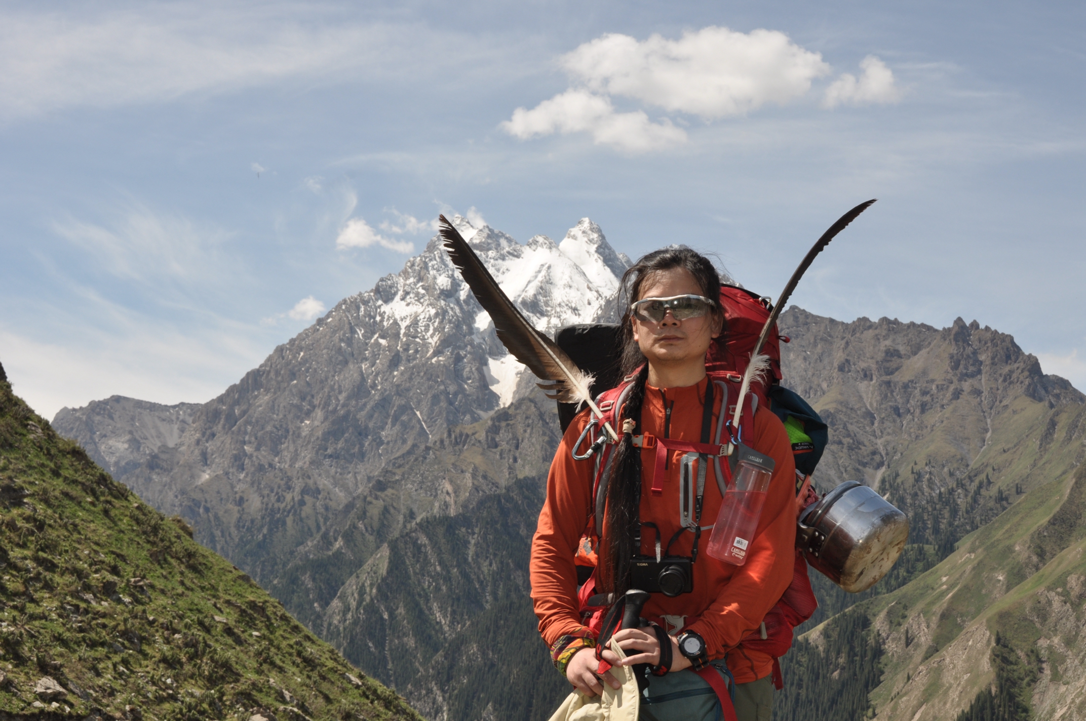 再往上爬不久,蛤蟆捡到两根鹰毛,我尾随而至,然后“送”给了我。二话不说,装饰一下。